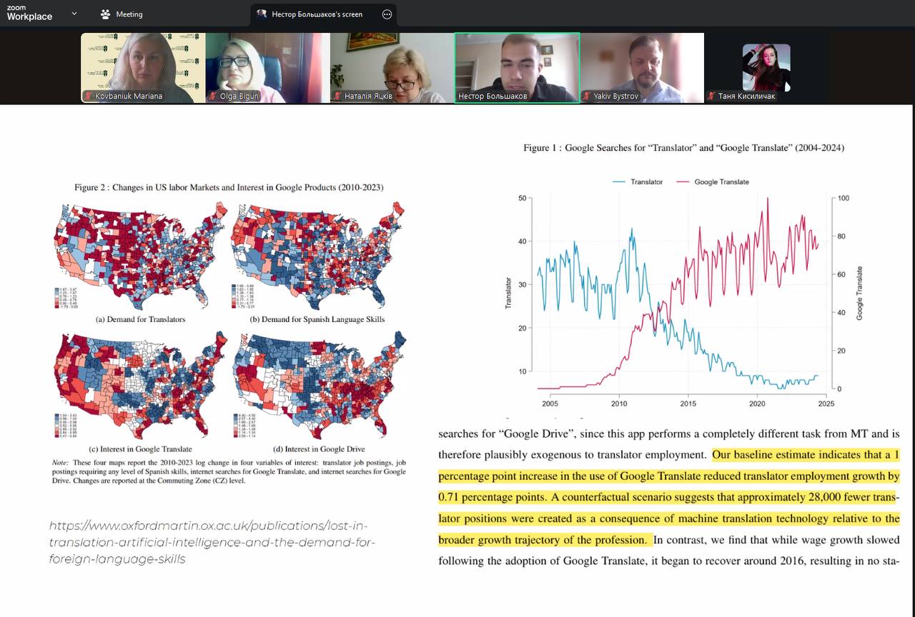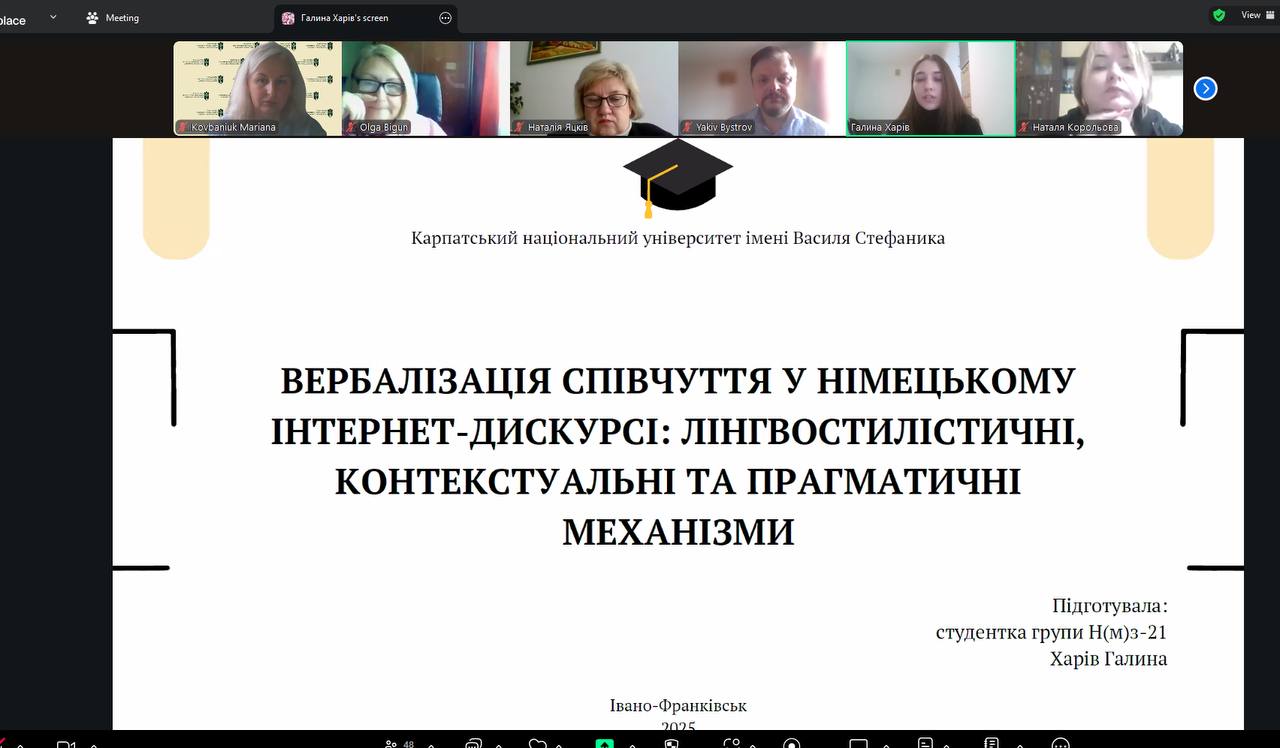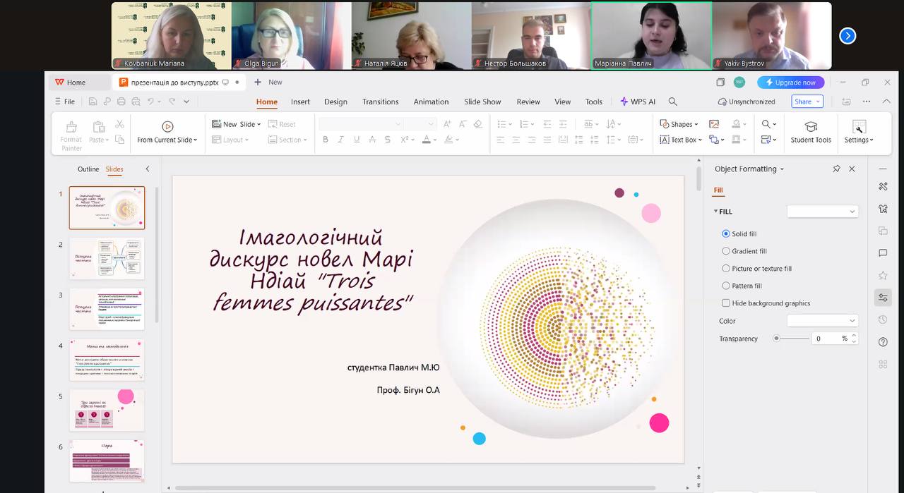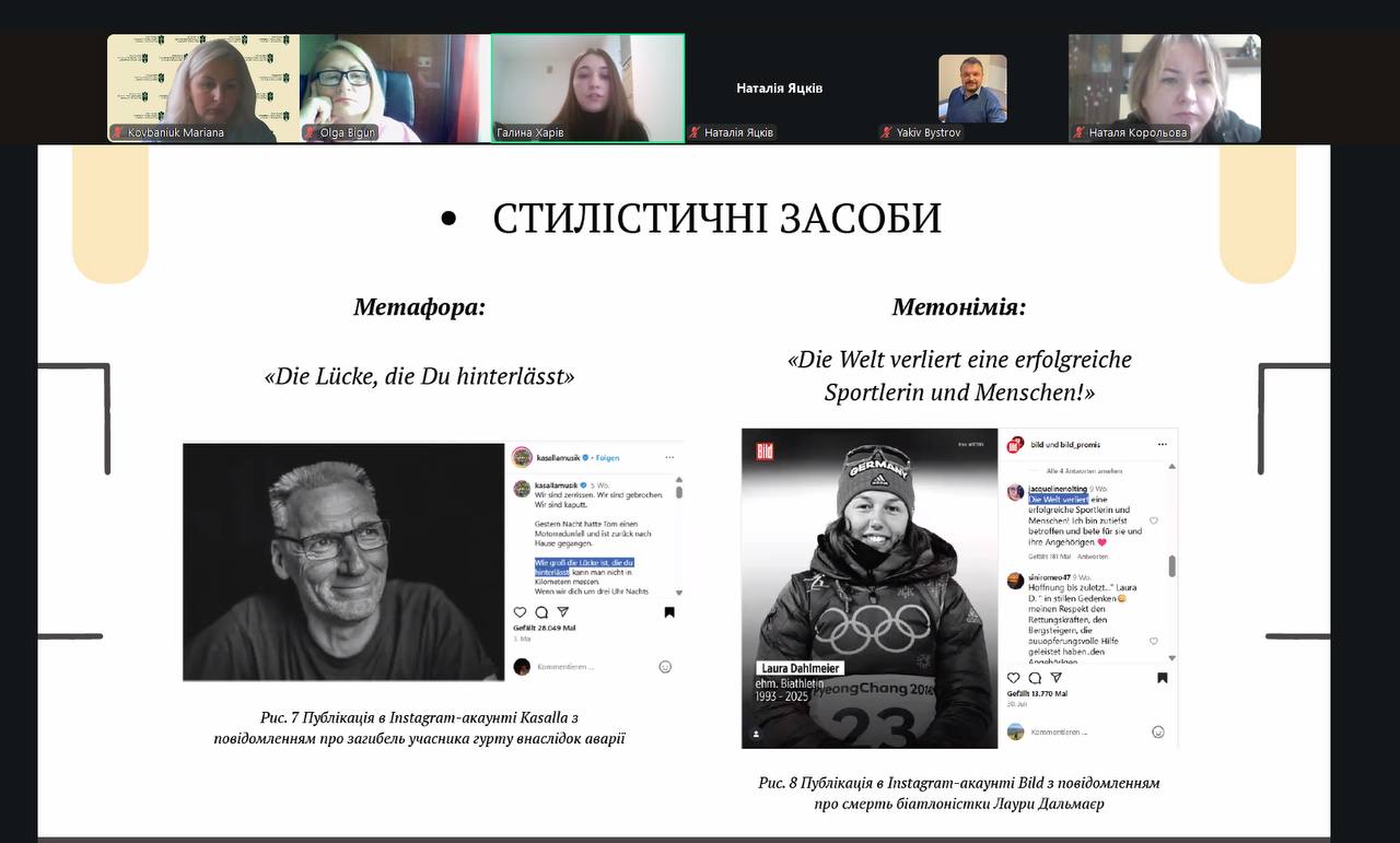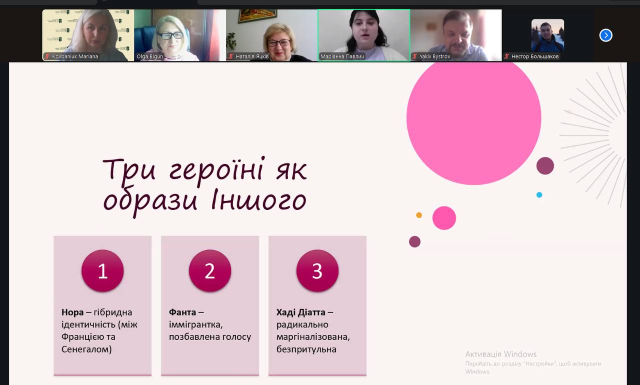 Модератор пленарного засідання, завідувачка кафедри французької філології Ольга Бігун, представила доповіді молодих дослідників факультету: Нестора Большакова «Роль штучного інтелекту у царині лінгвістичних професій (на основі дослідження Microsoft Research)», Маріанни Павлич «Імагологічний дискурс у новелах Марі Ндіай “Trois femmes puissantes”» та Галини Харів «Мовні засоби репрезентації співчуття у жанрі інтернет-коментаря у німецькій мові». У виступах доповідачів були викладені актуальні питання філології, що викликали цікаву дискусію та обговорення.